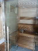 Pesuhuoneen ja saunan välinen seinä on kokonaan lasia ja